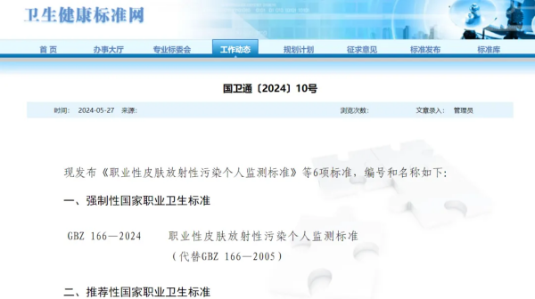 现发布《职业性皮肤放射性污染个人监测标准》等6项标准,编号和名称如下: